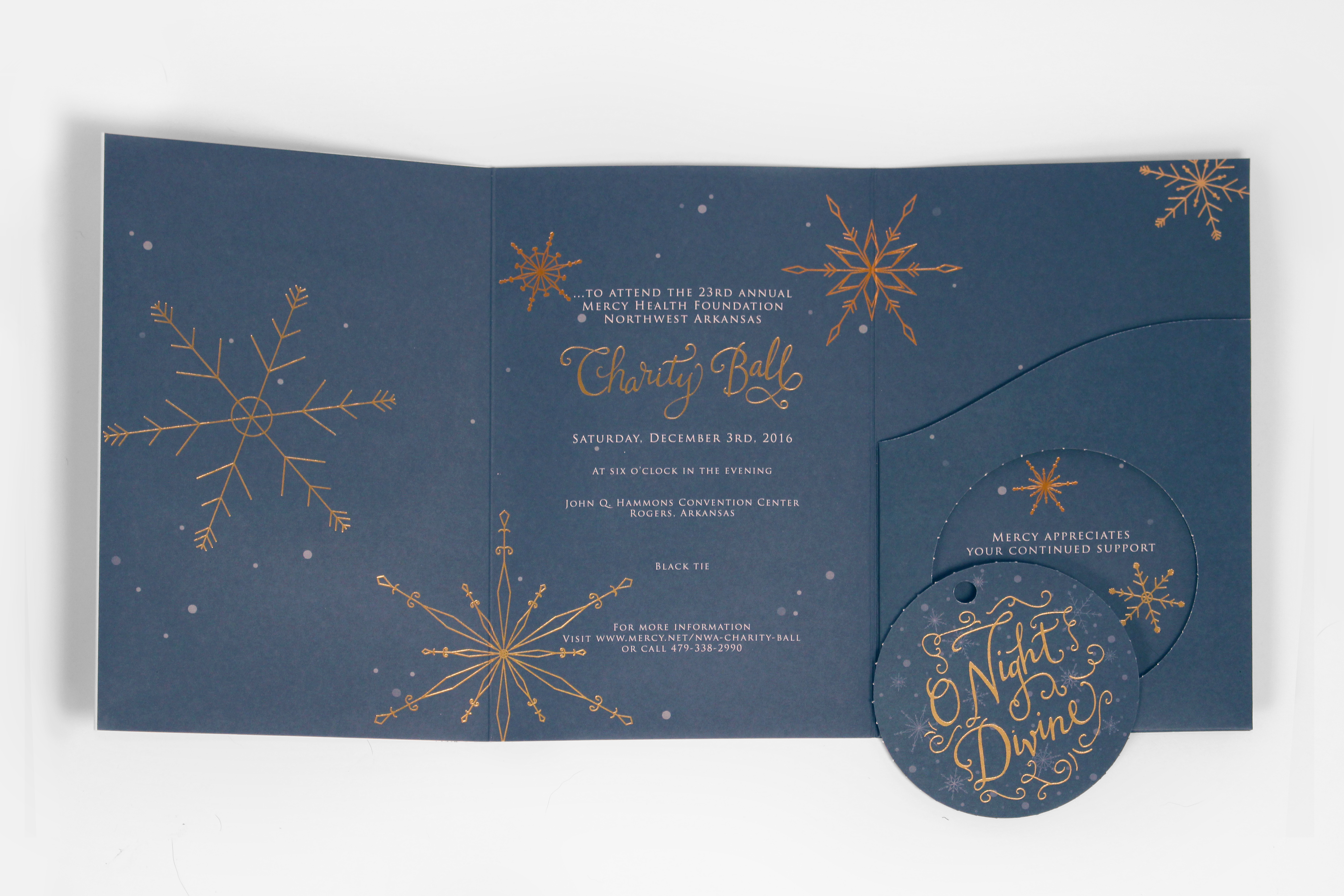 This project was completed on behalf of American Greetings for Mercy Health's annual Charity Ball. The cover of the card was designed first, with an emphasis on the finishings and shaker card aspect. Then the rest of the aspects of the card were created.